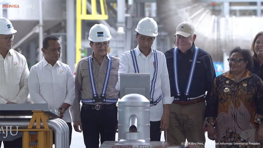PRESIDEN Joko Widodo (Jokowi) meresmikan aktivitas produksi smelter tembaga milik PT Freeport Indonesia di kawasan industri Java Integrated Industrial and Port Estate (JIIPE), Kecamatan Manyar, Gresik, Jawa Timur, pada Senin (23/9). Smelter senilai Rp 56 triliun tersebut memiliki kapasitas pengolahan konsentrat tembaga hingga 1,7 juta ton untuk menghasilkan 900 ribu ton katoda tembaga, 50 ton