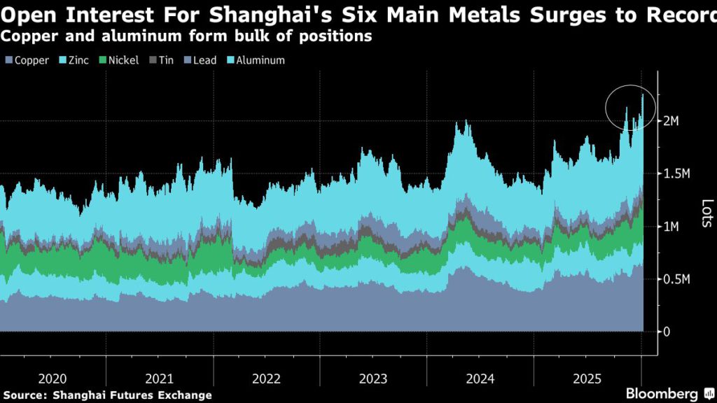 Open interest has surged to a record across the six base metals traded in Shanghai, indicating robust sentiment. Heightened geopolitical risk and expectations of a lower interest-rate environment in China and the US are also driving investors to pour capital into raw materials.